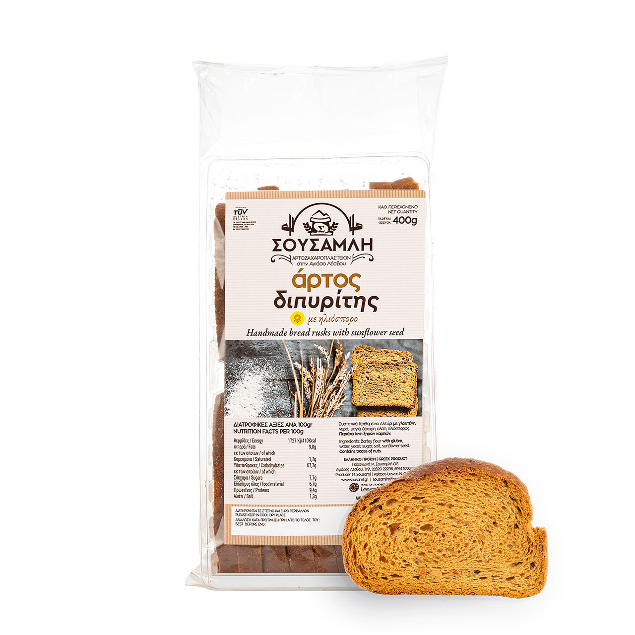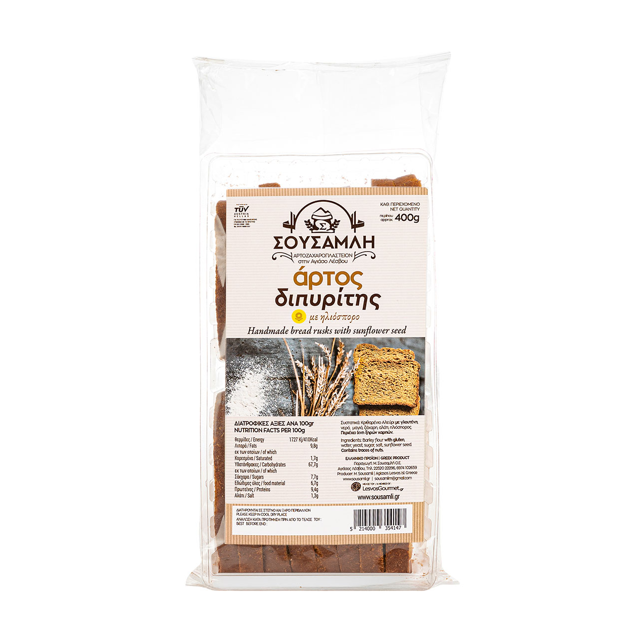 Η φρυγανιά διπυρίτης με ηλιόσπορο είναι φτιαγμένη από υψηλής ποιότητας αλεύρι, το οποίο υποβάλλεται σε διπλό ψήσιμο (δις στην πυρά) για να αποβάλλει όλη την υγρασία του και να αποκτήσει την χαρακτηριστική τραγανή υφή της.