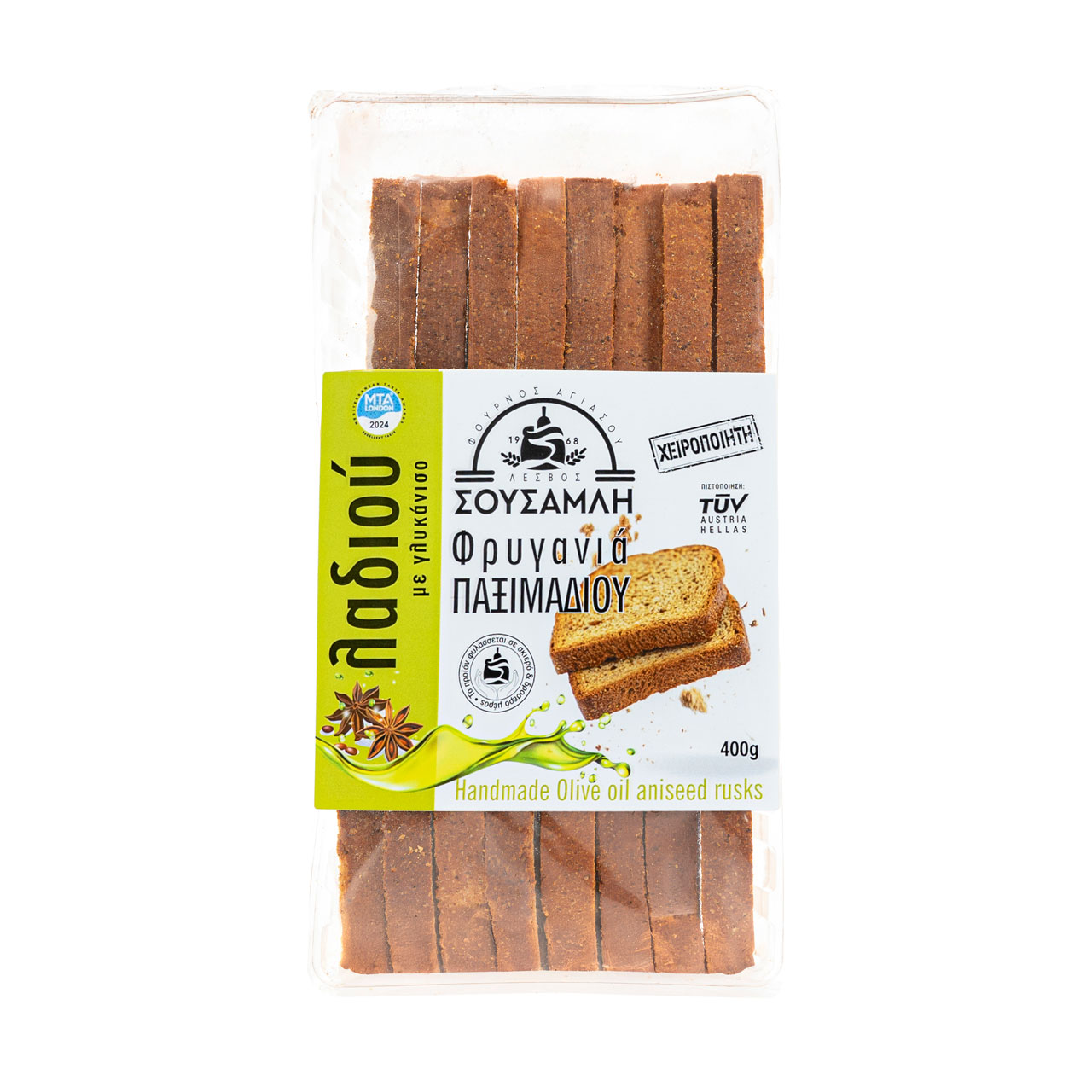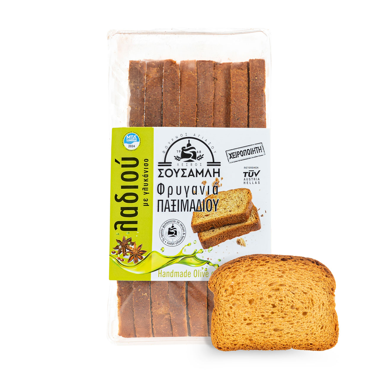 Οι παραδοσιακή φρυγανιά παξιμαδιού, λαδιού με γλυκάνισο, διατίθεται στις εξής συσκευασίες: