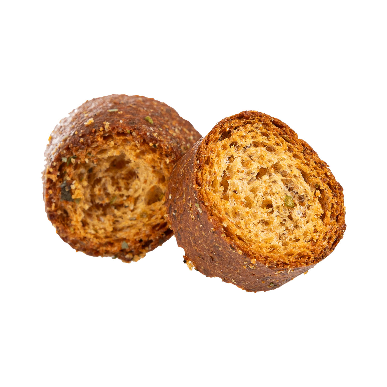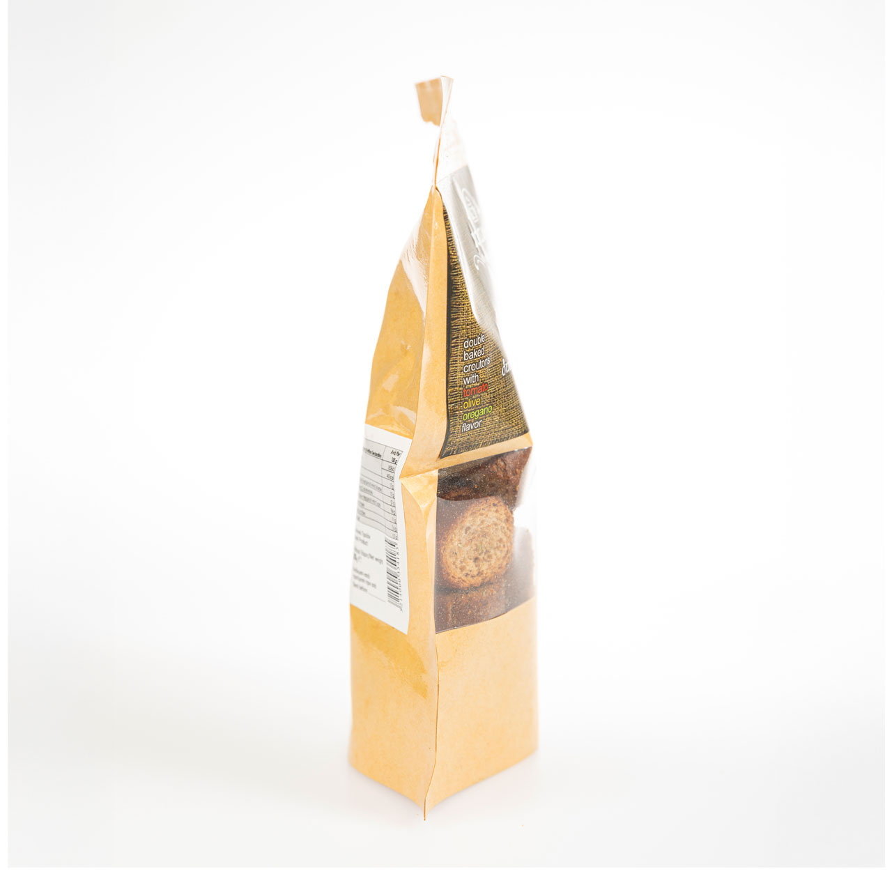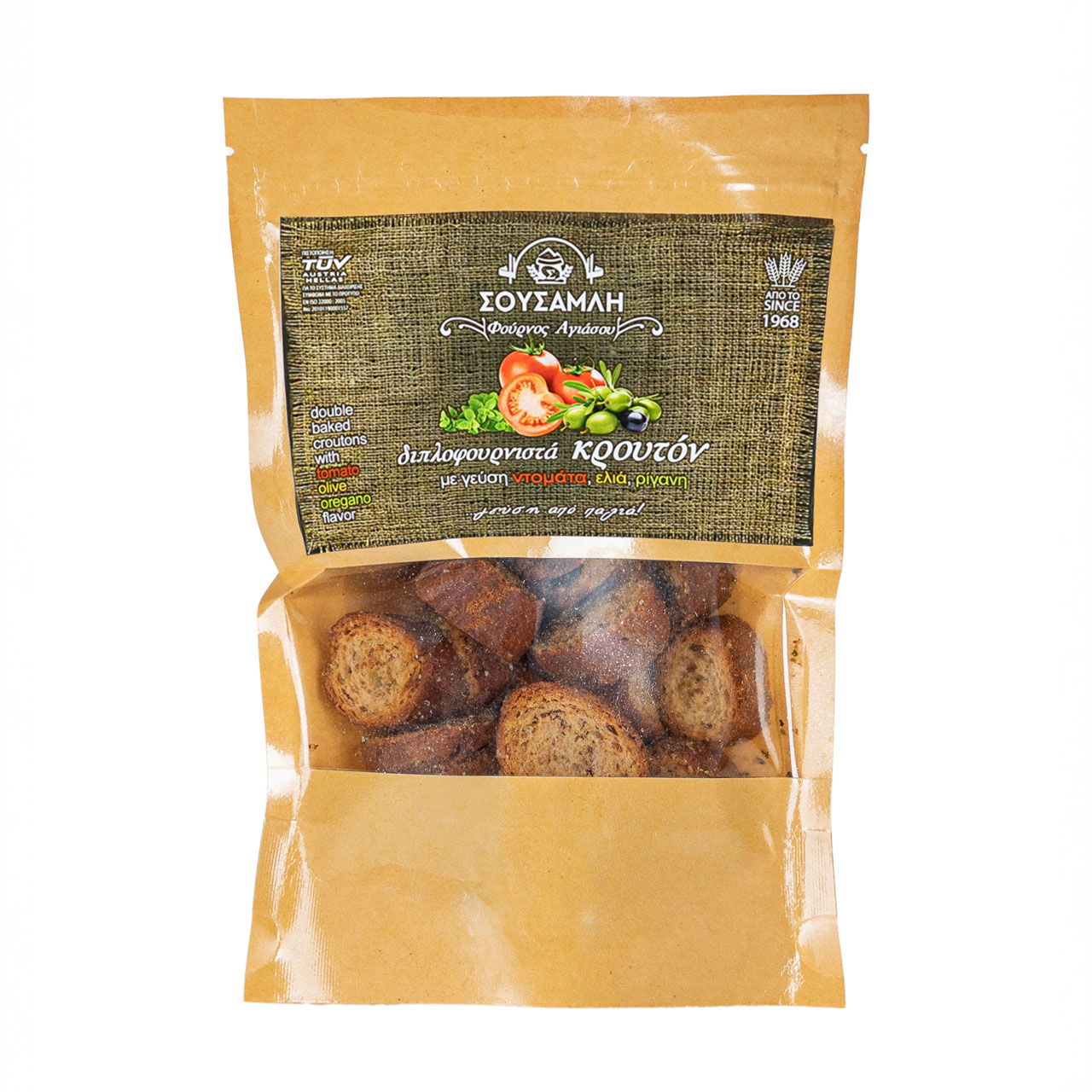 Τα κρουτόν με μεσογειακή γεύση, είναι διπλοφουρνιστά με γεύση ντομάτας, ελιάς και ρίγανης, είναι ένα εξαιρετικό συνοδευτικό ή σνακ, που συνδυάζει τραγανή υφή με αρωματικές γεύσεις από τη Μεσόγειο.