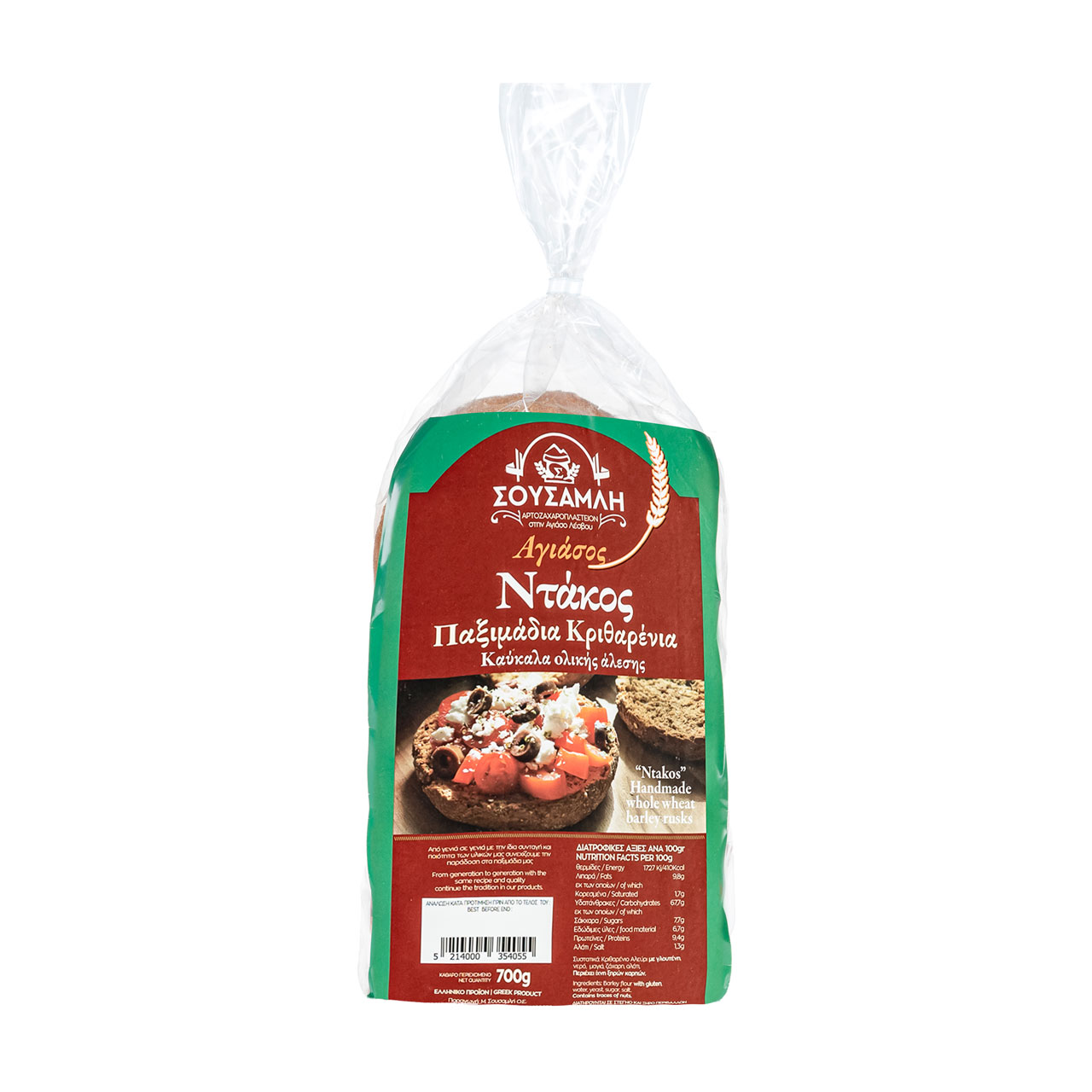 Παρασκευασμένος με αγνά υλικά και δημητριακά ολικής άλεσης, ο ντάκος του “Φούρνος Σουσαμλή Αγιάσου”, είναι πλούσιος σε φυτικές ίνες, προσφέροντας ενέργεια που διαρκεί και προάγοντας την καλή υγεία. Είτε τον απολαύσετε στην κλασική του μορφή με μυζήθρα και ρίγανη, είτε ως ένα γρήγορο, υγιεινό σνακ μέσα στη μέρα, προσφέρει μια αυθεντική γευστική εμπειρία που τιμά την παράδοση της Αγιάσου. Με κάθε μπουκιά, γεύεστε την ποιότητα και την αγάπη που βάζουμε στα προϊόντα μας εδώ και χρόνια, φέρνοντας την παράδοση της Λέσβου απευθείας στο τραπέζι σας.